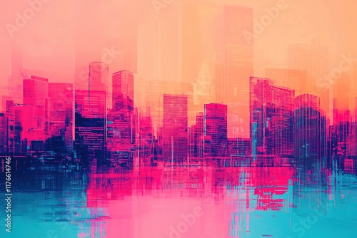 A vibrant, abstract city skyline with blended pink and blue hues reflecting on water, creating a dreamy and modern urban atmosphere.