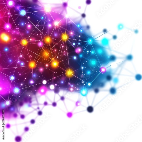 A vibrant abstract design featuring colorful dots and interconnected lines, resembling a network of stars or a digital galaxy.