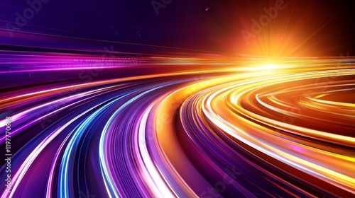 A vibrant abstract design featuring colorful light trails and a glowing horizon.