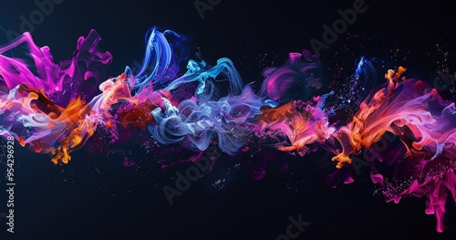 A vibrant abstract design featuring colorful swirling smoke and fluid shapes.