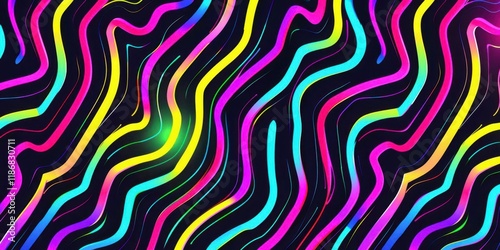 A vibrant abstract design featuring colorful wavy lines on a dark background.