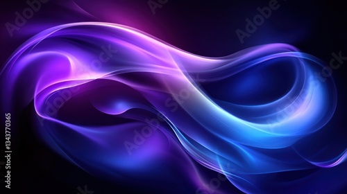 A vibrant abstract design featuring flowing waves of purple and blue light.
