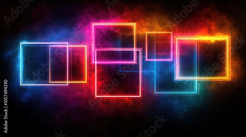 A vibrant, abstract design featuring glowing, colorful rectangles against a dark background.