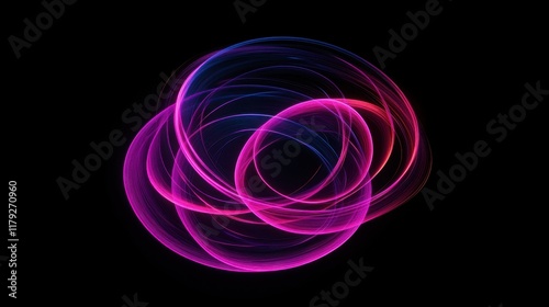 A vibrant, abstract design featuring intertwined loops in shades of pink and blue against a black background, creating a dynamic visual effect.