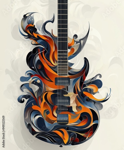 A vibrant, abstract design of a guitar with swirling colors and patterns.