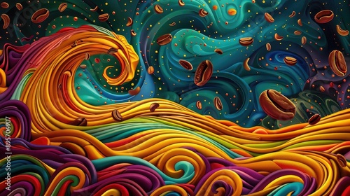 A vibrant abstract digital art piece with colorful waves and floating coffee beans, set against a swirling cosmic background.