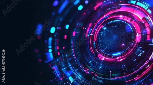 A vibrant abstract digital design with circular patterns and glowing elements, suggesting technology.