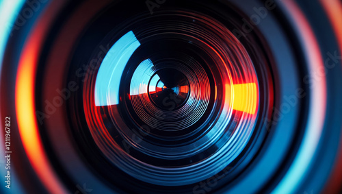 A vibrant, abstract front view close-up of a camera lens, a dynamic interplay of colors and reflections. Concept of high technology, television or film production, video shooting, movie industry