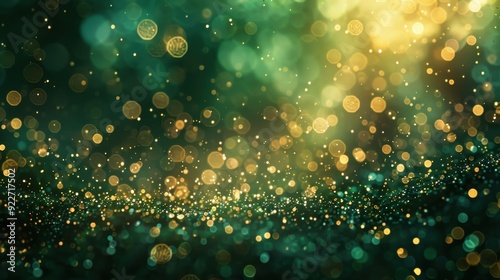 A vibrant, abstract green background with floating golden bokeh lights creating a magical atmosphere.