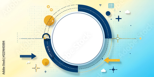 A vibrant abstract image features a central white circle surrounded by navy blue and yellow geometric shapes, arrows, and a pastel color gradient background. It evokes technology and innovation.