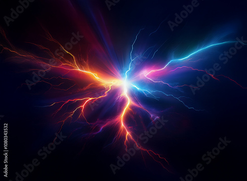 A vibrant abstract image of blue and orange electric energy bursting from a central point. The image is dark, with the energy emanating into a wing-like shape.
