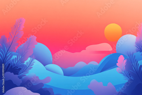A vibrant, abstract landscape featuring bold pink, blue, and orange hues, evoking a surreal and fantastical environment