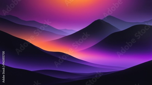 A vibrant, abstract landscape of rolling hills in shades of purple and orange at dusk.