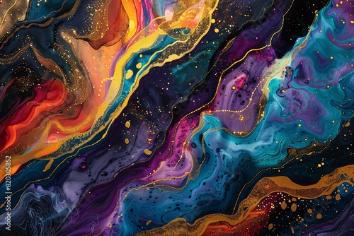 A vibrant abstract organic form that blends fluid, realistic, and fantastical elements. Painting on Dark Background with Gold Brush Strokes