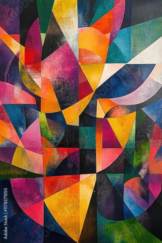 A vibrant abstract painting featuring geometric shapes and bold colors.