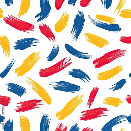 A vibrant abstract pattern featuring bold strokes in red, blue, and yellow on a white background, ideal for modern design projects.