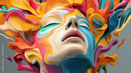 A vibrant, abstract portrait featuring a woman's face with colorful, swirling paint resembling hair, conveying emotion and creativity.