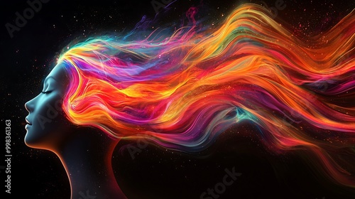 A vibrant, abstract portrayal of a woman’s profile with colorful, flowing hair against a dark background, symbolizing creativity and energy.