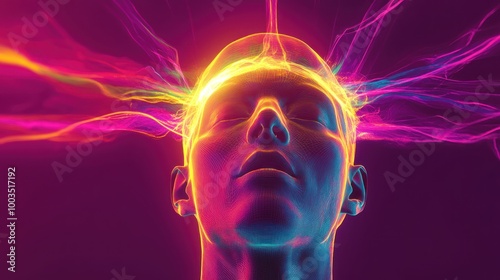 A vibrant, abstract representation of consciousness and creativity emanating from a human head.