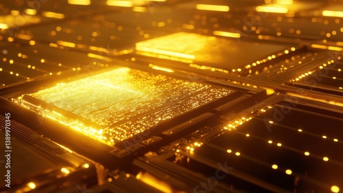 A vibrant, abstract representation of electronic circuitry, featuring glowing golden chips interconnected in a dynamic, high-tech environment.