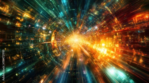 A vibrant, abstract representation of light and energy, suggesting movement through space.