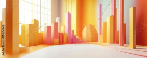 A vibrant, abstract scene featuring colorful vertical structures in shades of yellow and pink, creating a lively, cityscape-like atmosphere.