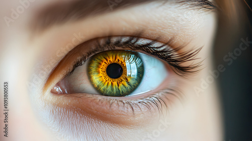 A vibrant amber-green eye under warm light showing radial striations across the iris.