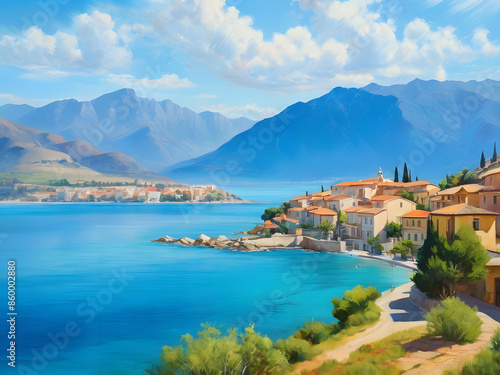 A vibrant and bustling Caribbean town, with lush green mountains and the crystal blue sea, an oil painting.