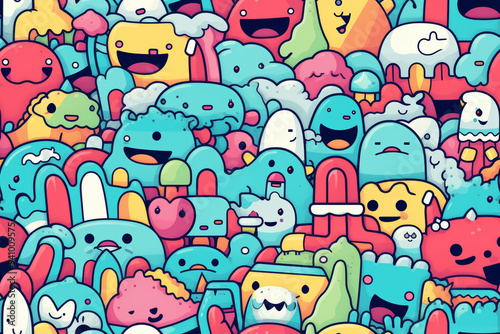 A vibrant and colorful background filled with happy, quirky cartoon characters with various shapes and expressions, forming a seamless pattern.