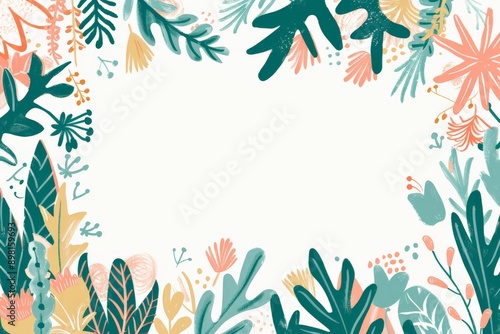 A vibrant and colorful botanical border featuring various leaves, flowers, and plants in shades of green, pink, and yellow, framing an empty white space in the center.