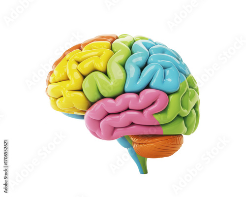 A vibrant and colorful brain model showcasing different sections on a black and white background space on transparent background