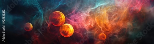 A vibrant and colorful depiction of cosmic elements including glowing spheres and swirling nebulae, perfect for space-themed projects.