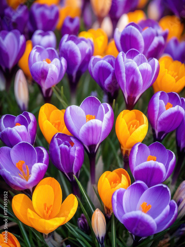 A vibrant and colorful display of blooming crocuses in rich purple and golden yellow hues, celebrating the essence of springtime. Generative AI