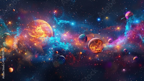 A vibrant and colorful nebula with multiple planets and stars.