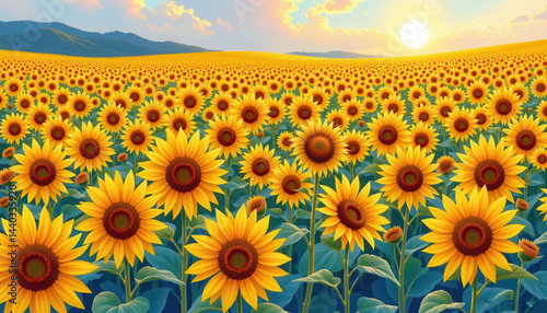 A vibrant and colorful painting of a vast sunflower field covered in golden blooms, with a soft and dreamy watercolor texture that brings the scene to life.