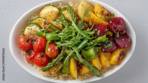 A vibrant and colorful quinoa bowl is presented with grilled vegetables, including tomatoes, zucchini, asparagus, beets, and yellow peppers, on a white bowl.
