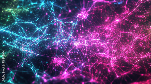 A vibrant and complex network of interconnected lines and nodes, rendered in a bright and saturated mix of blue, pink, and purple colors against a dark background. The image creates a sense of dynamic
