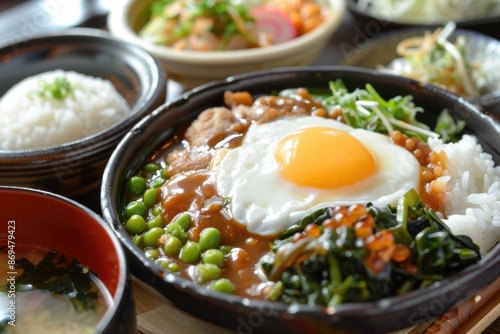 A vibrant and delicious meal featuring rice, vegetables, and a perfectly cooked sunny-side-up egg, served in a traditional Japanese setting.
