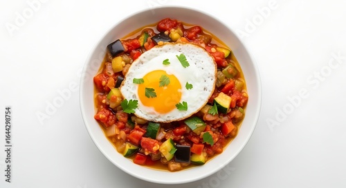 A vibrant and delicious Ratatouille dish, topped with a perfectly fried egg. The dish is artfully arranged, and is ready to eat.