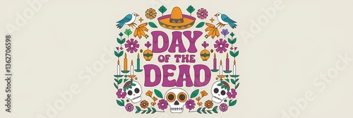 A vibrant and festive Day of the Dead design with bold central text surrounded by colorful sugar skulls marigold flowers traditional sombrero candles, decorative birds in a symmetrical arrangement