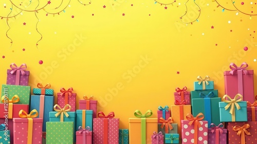 A vibrant and festive stack of colorful gifts in a variety of sizes and patterns perfect for any celebratory occasion, background, celebration, gift