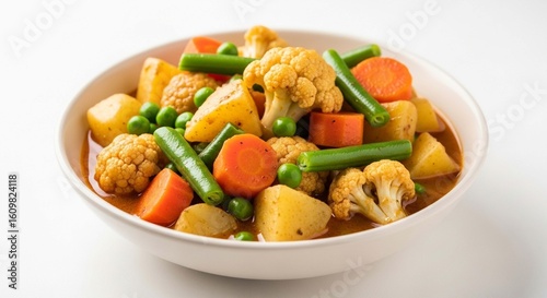 A vibrant and healthy bowl of mixed vegetable stew or curry, featuring potatoes, carrots, green beans, peas, and cauliflower.