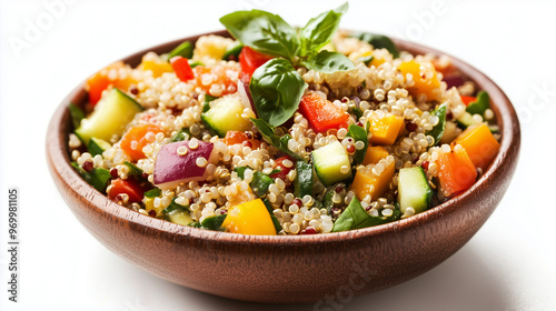 A vibrant and healthy bowl of quinoa salad with fresh vegetables including tomatoes, cucumbers, bell peppers, and leafy greens, garnished with basil leaves.