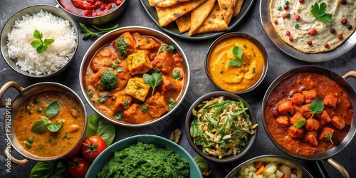 A vibrant and mouthwatering Indian food spread featuring butter chicken, palak paneer, chicken tikka, biryani, and more on a dark background