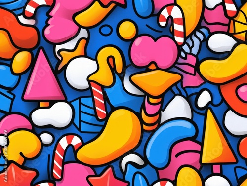 A vibrant and playful abstract pattern filled with colorful shapes and designs.