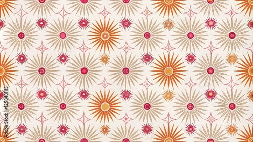 A vibrant and playful textile design featuring stylized floral motifs in sunset hues and beige