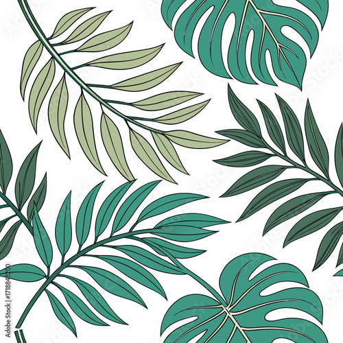 A vibrant and refreshing pattern featuring a variety of tropical palm leaves and monstera leaves in shades of green and teal against a clean white background