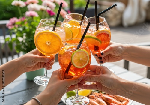 A vibrant and refreshing summer scene featuring three hands holding elegant cocktail glasses filled with colorful citrus drinks
