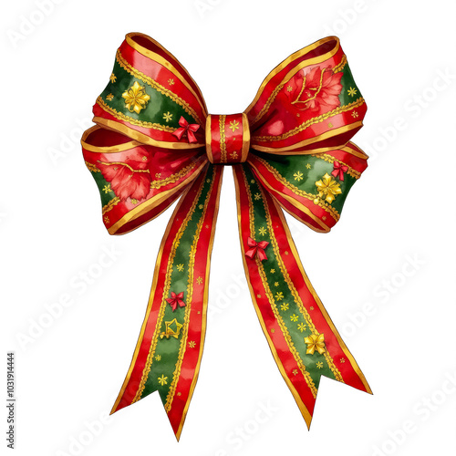 A vibrant and richly colored bow designed for Christmas adorns gifts and holiday decorations, featuring deep greens with pops of red and gold accents.