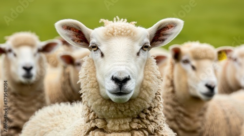 A vibrant and sharp photo of a white sheep amidst a flock in a pastoral countryside setting, focus cover all object